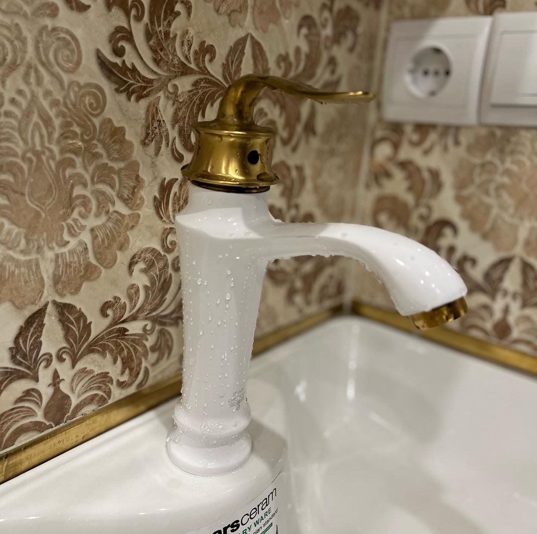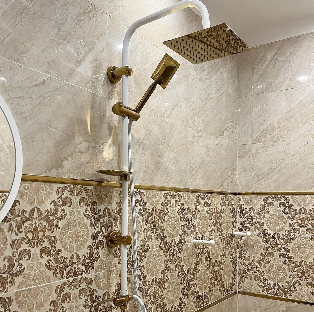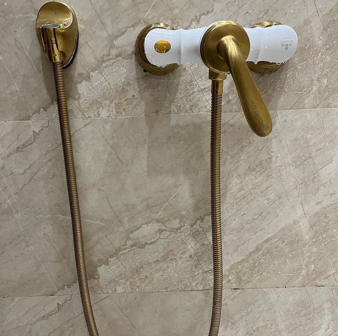 ست شیرالات 6 تکه آیدا مدل بامبو رنگ سفید طلا همراه علم دوش و شلنگ توالت