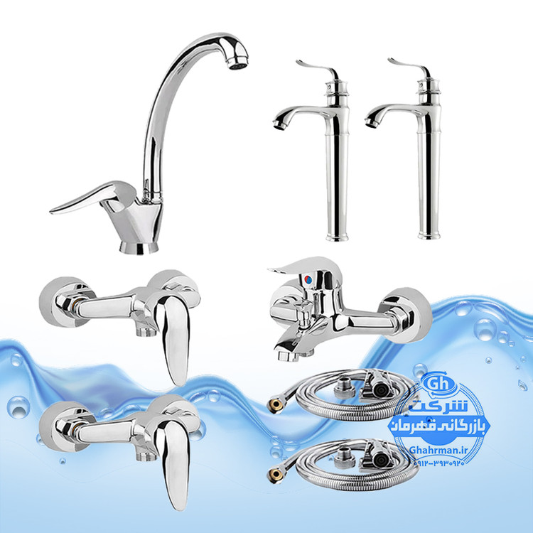 ست ۸ عددی شیرآلات برند آیدا صنعت مدل دنیز | شیر ظرفشویی + دو عدد روشویی پایهبلند + حمام + دو عدد توالت + دو شلنگ توالت | کروم براق