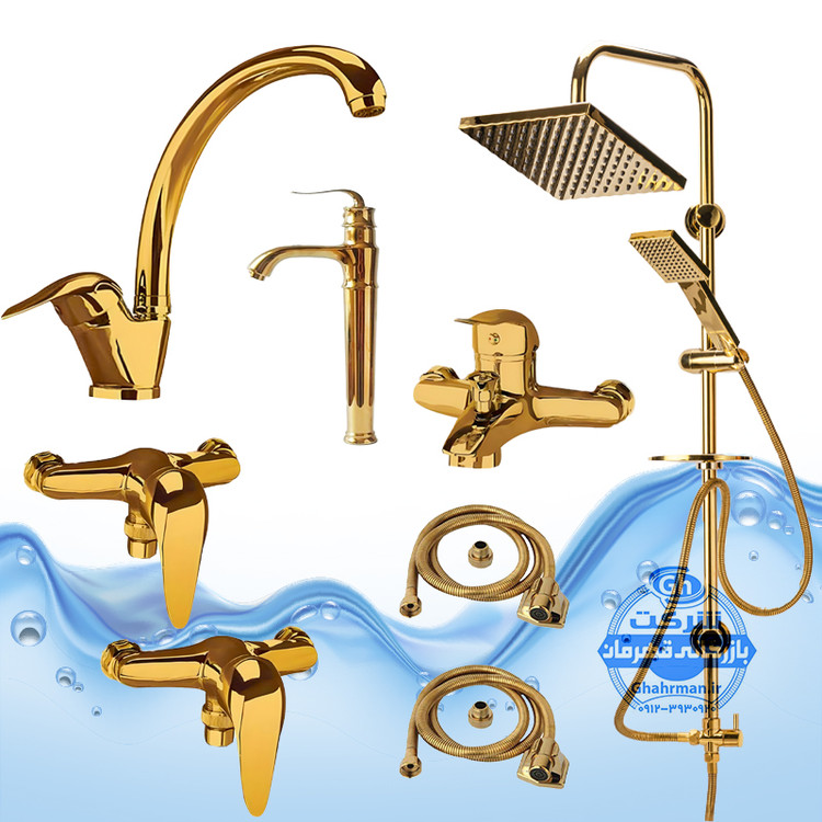 ست ۸ عددی شیرآلات برند آیدا صنعت مدل دنیز | شیر ظرفشویی + روشویی پایه‌بلند + حمام + دو عدد توالت + علم دوش یونیورست رسوب‌گیر اتومات + دو شلنگ توالت | طلایی براق
