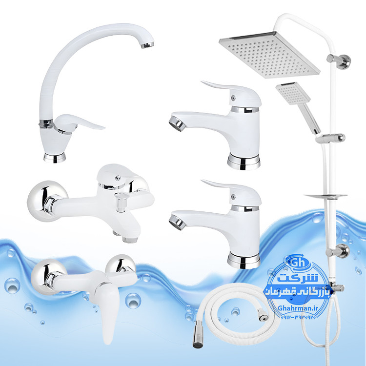 ست ۷ عددی شیرآلات برند آیدا صنعت مدل دنیز | شیر ظرفشویی + ۲ عدد روشویی + حمام + توالت + علم دوش رسوب‌گیر اتومات + شلنگ توالت | سفید کروم براق