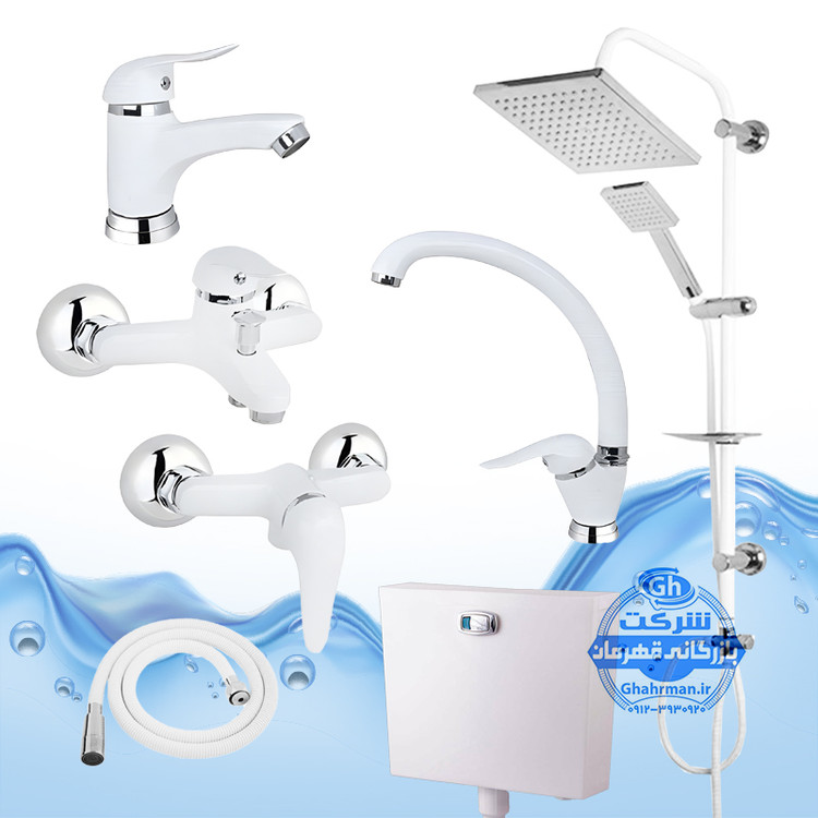 ست ۷ عددی شیرآلات برند آیدا صنعت مدل دنیز | شیر ظرفشویی + روشویی + حمام + توالت + علم دوش رسوبگیر اتومات + شلنگ توالت + فلاش تانک | سفید کروم براق