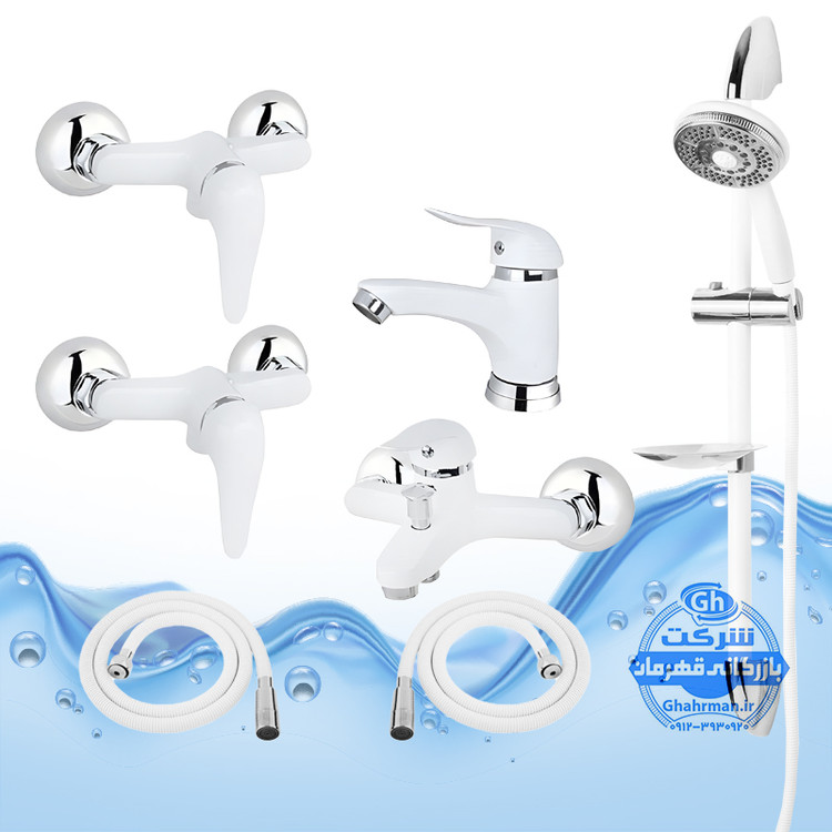 ست ۷ عددی شیرآلات برند آیدا صنعت مدل دنیز | شیر حمام + روشویی + دو عدد شیر توالت + علم دوش یونیکا + دو عدد شلنگ توالت | سفید کروم براق