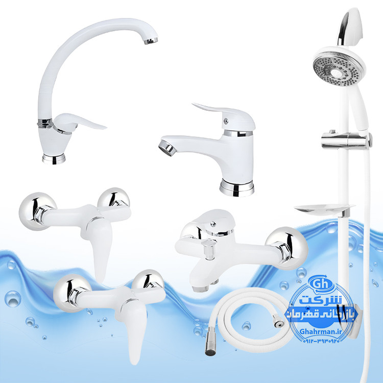 ست ۷ عددی شیرآلات برند آیدا صنعت مدل دنیز | شیر ظرفشویی + دو عدد روشویی + حمام + دو عدد توالت + علم دوش یونیکا + شلنگ توالت | سفید کروم براق