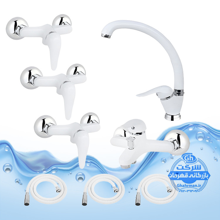 ست ۸ عددی شیرآلات برند آیدا صنعت مدل دنیز | شیر ظرفشویی + حمام + سه عدد توالت + سه شلنگ توالت | سفید کروم براق