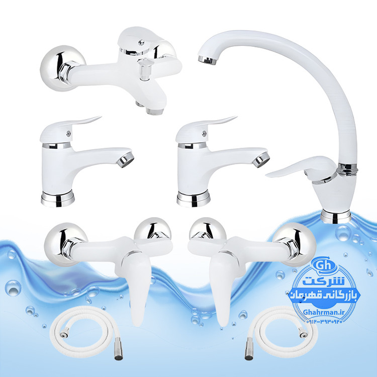 ست ۸ عددی شیرآلات برند آیدا صنعت مدل دنیز | شیر ظرفشویی + دو عدد روشویی + حمام + دو عدد توالت + دو شلنگ توالت | سفید کروم براق