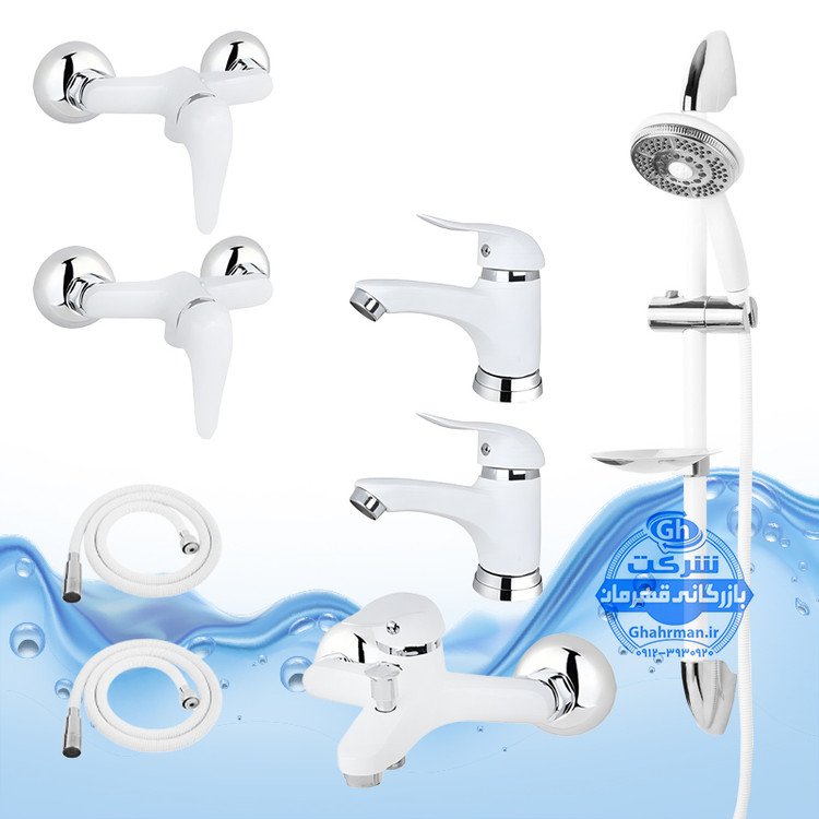 ست ۸ عددی شیرآلات برند آیدا صنعت مدل دنیز | دو عدد شیر روشویی + حمام + دو عدد توالت + علم دوش یونیکا متحرک ضد رسوب + دو شلنگ توالت | سفید کروم براق
