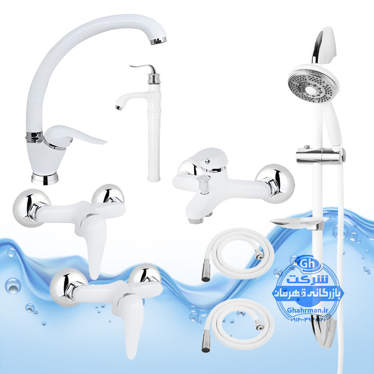 ست ۸ عددی شیرآلات برند آیدا صنعت مدل دنیز | شیر ظرفشویی + روشویی پایه‌بلند + حمام + دو عدد توالت + علم دوش یونیکا متحرک ضد رسوب + دو شلنگ توالت | سفید کروم براق