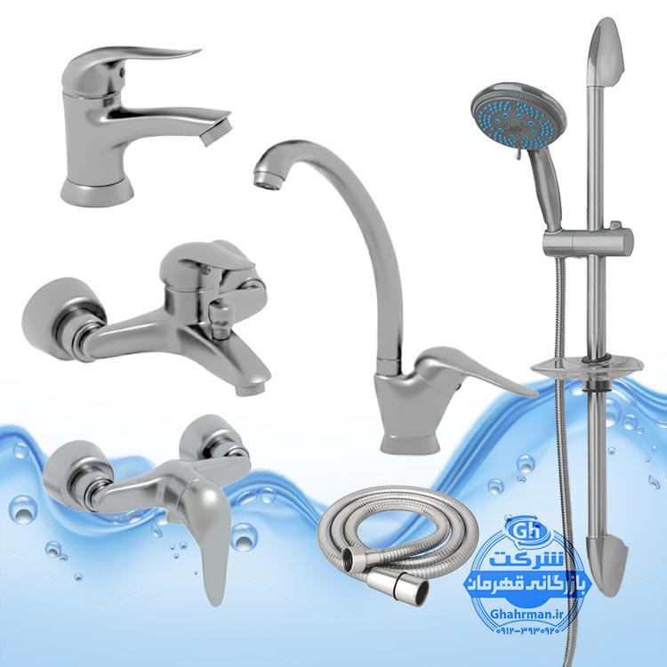 ست ۶ عددی شیرآلات برند آیدا صنعت مدل دنیز | شیر ظرفشویی + روشویی + حمام + توالت + علم دوش یونیکا + شلنگ توالت | کروم مات