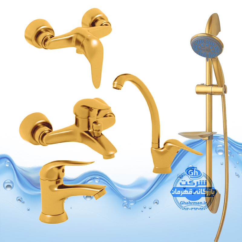 ست ۵ عددی شیرآلات مدل دنیز | شیر روشویی + شیر ظرفشویی + توالت + حمام + علم دوش یونیکا | طلایی مات