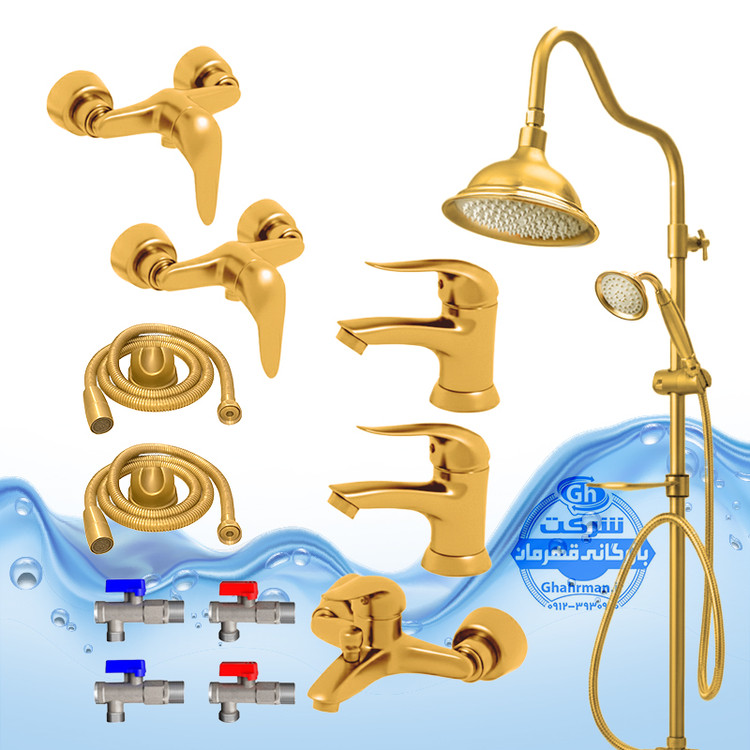 ست ۱۲ عددی شیرآلات برند آیدا صنعت مدل دنیز | دو عدد شیر روشویی + شیر حمام + شیر توالت + علم دوش شیپوری + دو عدد شلنگ توالت + چهار عدد شیر پیسوار | طلایی مات