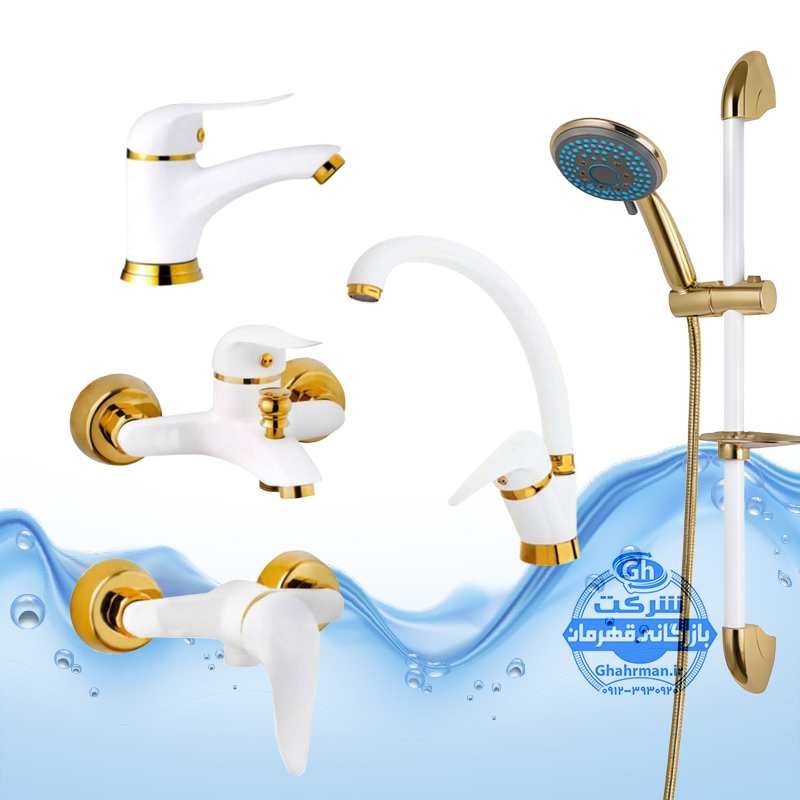 ست ۵ عددی شیرآلات مدل دنیز | شیر روشویی + شیر ظرفشویی + توالت + حمام + علم دوش یونیکا | سفید طلایی