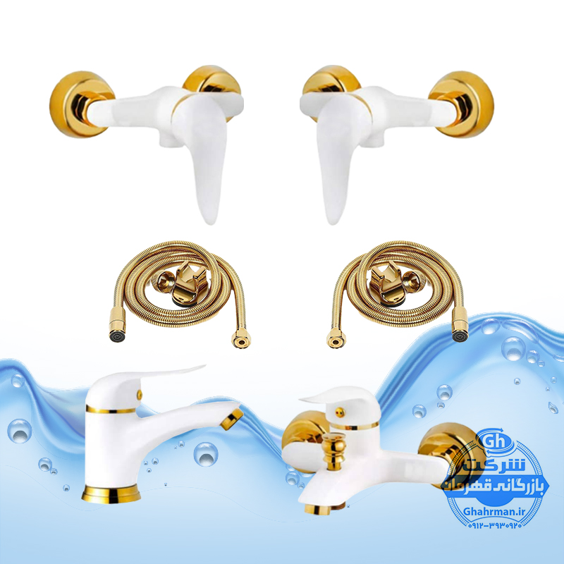 ست ۶ عددی شیرآلات مدل دنیز | ۲ عدد شیر توالت + ۲ عدد شلنگ توالت + شیر حمام + شیر روشویی | سفید طلایی