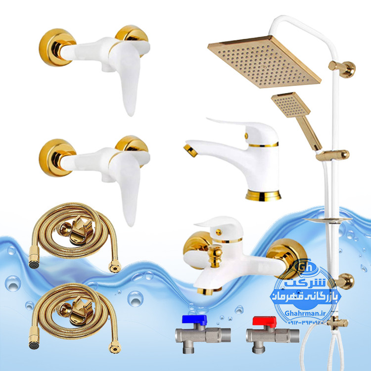 ست ۹ عددی شیرآلات برند آیدا صنعت مدل دنیز | شیر روشویی + حمام + دو عدد توالت + علم دوش یونیورست رسوبگیر اتومات + دو شلنگ توالت + دو عدد پیسوار برنجی | سفید طلایی
