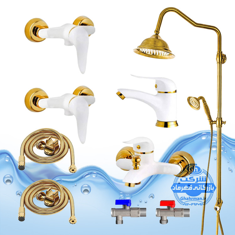 ست ۹ عددی شیرآلات برند آیدا صنعت مدل دنیز | شیر روشویی + حمام + دو عدد توالت + علم دوش یونیورست مدل شیپوری + دو شلنگ توالت + دو عدد شیر پیسوار | سفید طلایی