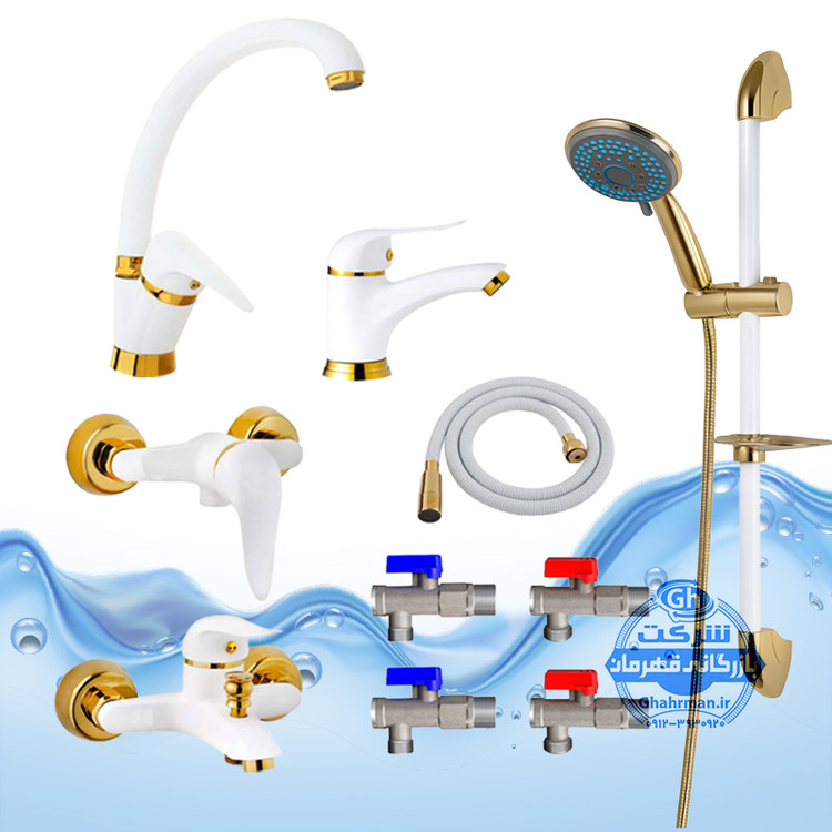ست ۱۰ عددی شیرآلات برند آیدا صنعت مدل دنیز | شیر ظرفشویی + شیر روشویی + شیر حمام + شیر توالت + علم دوش یونیکا + شلنگ توالت + چهار عدد شیر پیسوار | سفید طلایی