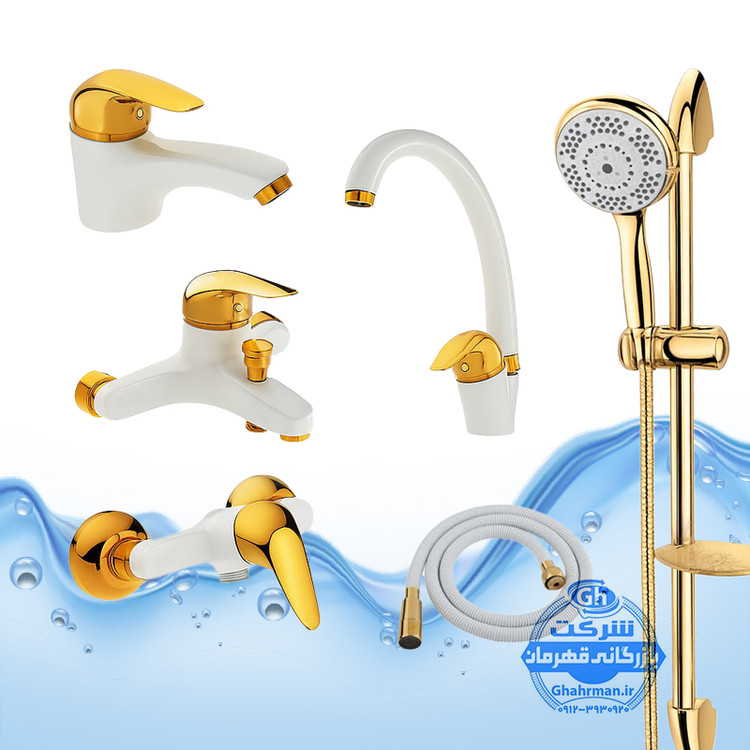 ست ۶ عددی شیرآلات برند آیدا صنعت مدل قهرمان | شیر ظرفشویی + روشویی + حمام + توالت + علم دوش یونیکا + شلنگ توالت | سفید طلایی