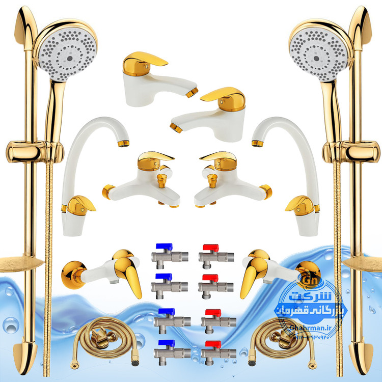 ست ۲۰ عددی شیرآلات برند آیدا صنعت مدل قهرمان اردکی | دو عدد شیر ظرفشویی + دو عدد شیر روشویی + دو عدد شیر حمام + دو عدد شیر توالت + دو عدد علم دوش یونیورست مدل یونیکا کروم + دو عدد شلنگ توالت + دو عدد شلنگ استیل + هشت عدد شیر پیسوار | سفید طلایی