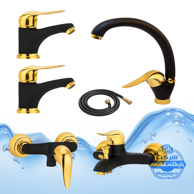 ست ۶ عددی شیرآلات مدل دنیز | شیر ظرفشویی + ۲ عدد روشویی + حمام + توالت + شلنگ توالت | مشکی طلایی
