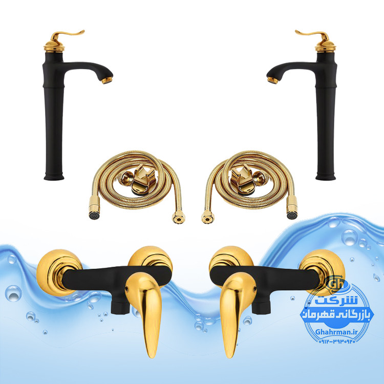 ست ۶ عددی شیرآلات مدل دنیز | ۲ عدد شیر روشویی پایه‌بلند بامبو + ۲ عدد شیر توالت + ۲ عدد شلنگ توالت | مشکی طلایی