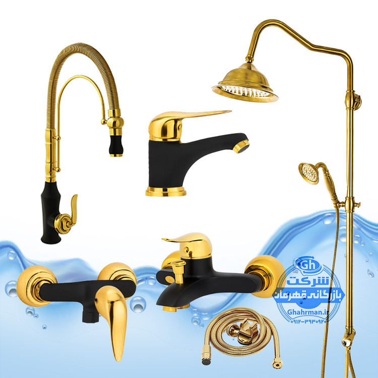 ست ۶ عددی شیرآلات برند آیدا صنعت مدل دنیز | مشکی طلایی | ظرفشویی بامبو فنری + علم دوش شیپوری