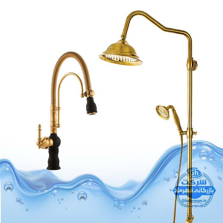 ست ۲ عددی شیر ظرفشویی بیزانس تک‌منظوره و علم دوش یونیورست مدل شیپوری | مشکی طلایی | شیرآلات برند آیدا صنعت مدل دنیز
