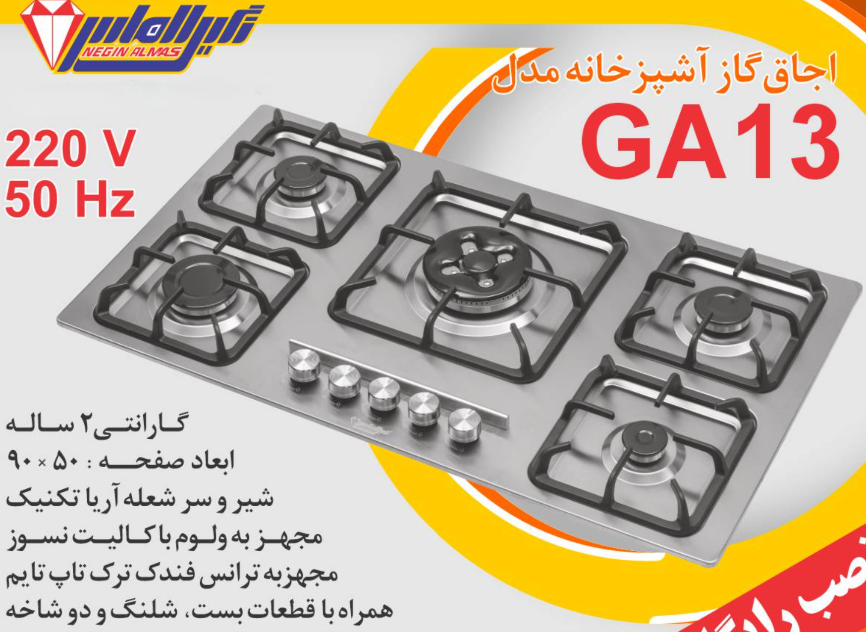 اجاق گاز صفحه استیل نگین الماس کد GA13 ابعاد 50×90